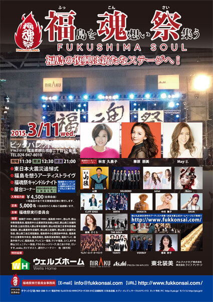 第一部 東日本大震災追悼式 第二部 福島を想うアーティストライヴ ●屋外イベント 福島の食材を使ったグルメ屋台(11:00~20:00) 福魂祭キャンドルナイト(日没から) |